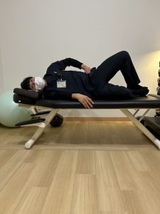 施術者「仰向けになります。脚をまっすぐ伸ばしたまま、5cmほど浮かせてみてください。」
