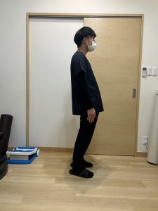 - 姿勢:骨盤の位置が足の位置よりも前にずれていて、腰が反っている。