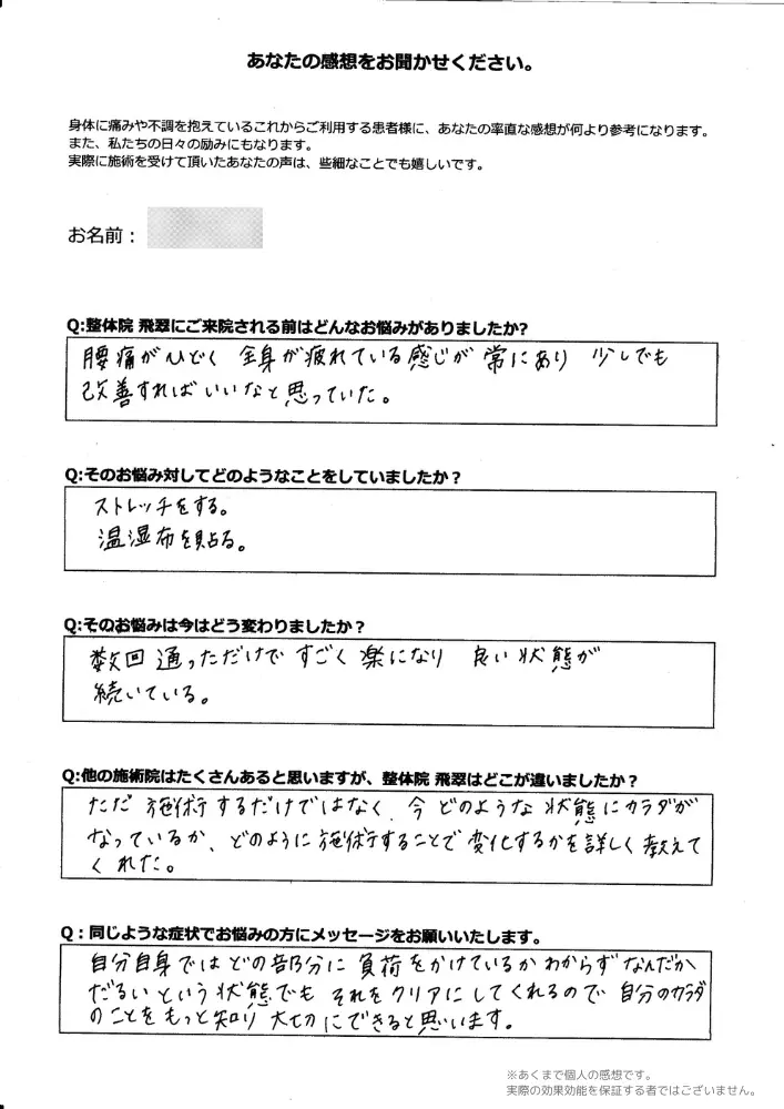 病院に行ってもよくならなかったが、飛翠整体院に通うようになり、腰痛、足の痛み、肩こりが良くなったので是非施術を受けてみてください。肩こりや腰痛の原因や予防の仕方も丁寧に教えてくださいます。