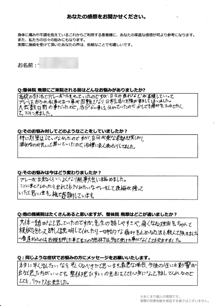 高校の部活でバレーボールをやっていたのですが日々の疲れなどが蓄積していってプレーはおろか歩くことや立つことが困難となり日常生活に支障が発生してしまいました。大会数日前のことだったので治らないことはわかってたので少しでも痛みを引かせたくこちらに来ました。