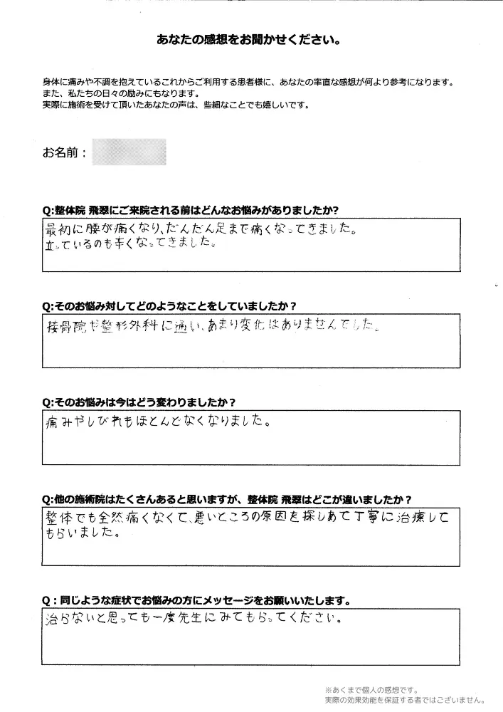 ネットで探した整体院を疑問視される方、一度飛翠さんに来てみてはいかがでしょうか。私のようにウソのように痛みは和らぎ一人で歩けるようになると思います。