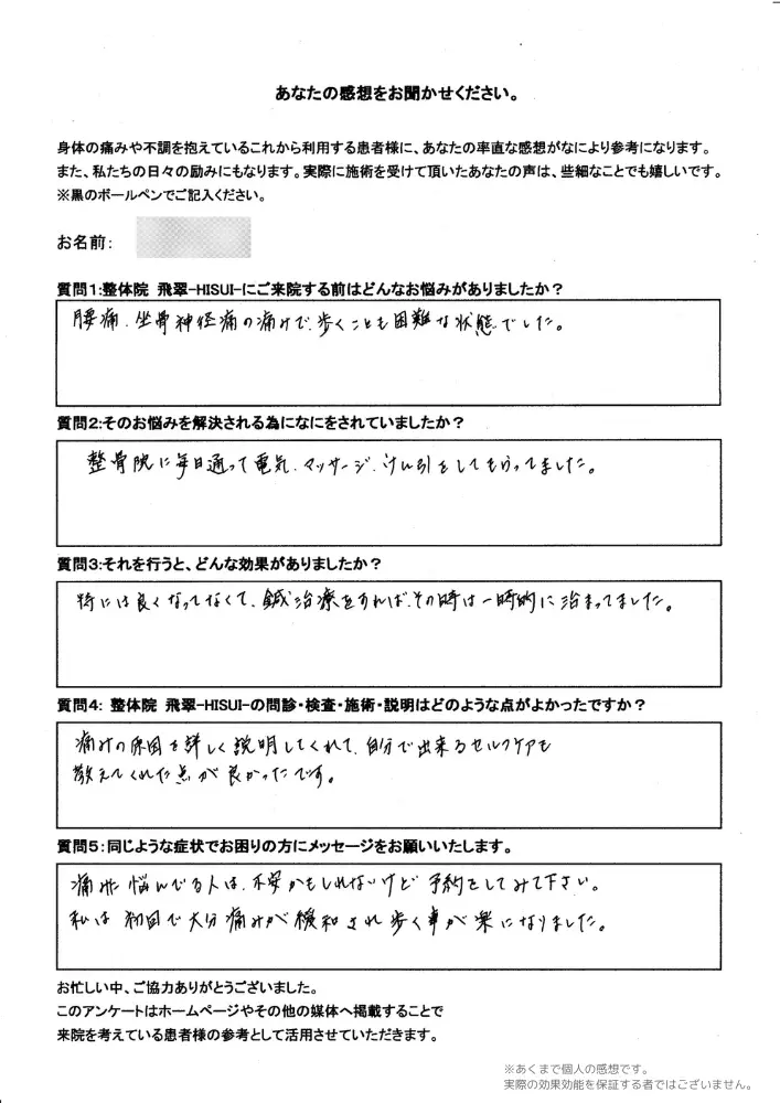 腰痛・坐骨神経痛の痛みで歩くことも困難な感じでした。