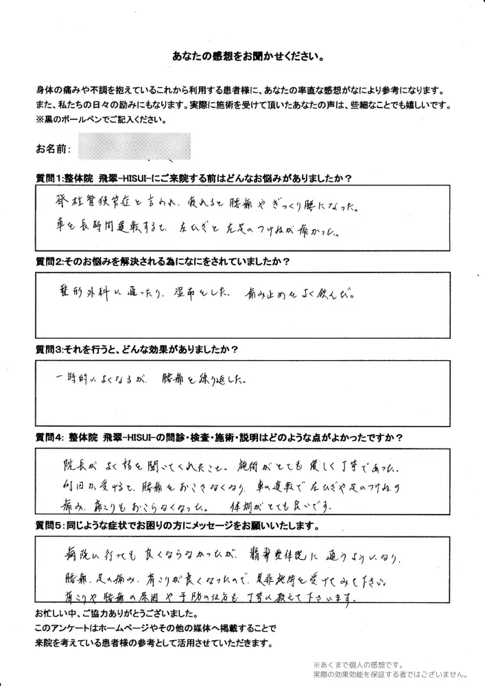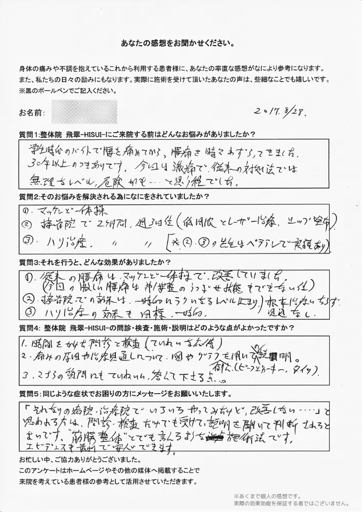 ずっと悩んできた人も、痛みが出始めて悩んでいる方も一度先生にみてもらってください。症状の不安から解放されてやりたいことができるようになります。私もその一人だったので先生にはとても感謝しています。