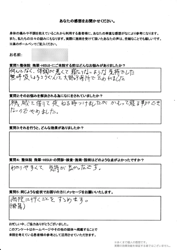 なんとなく、体調が悪くて寝足りないような気持ちでした。無呼吸症候群と大野診療所で言われました。